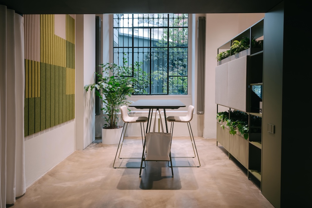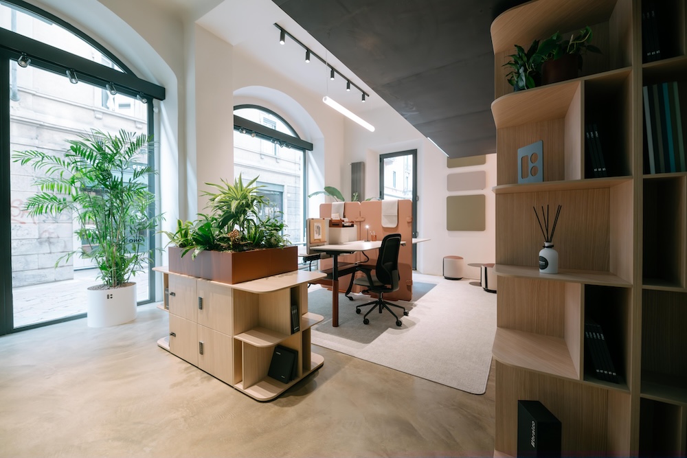 Il percorso espositivo alterna ambienti direzionali e postazioni operative, restituendo una lettura articolata del workplace contemporaneo. Tra i prodotti presenti compaiono il tavolo Rail della collezione Exe, i bench e i tavoli della linea S18, le soluzioni Nuvola e il tavolo alto Take Off, affiancati ai sistemi di contenimento Arkki nelle versioni Concerto, Aba e Aba Jour. Una selezione che mette a fuoco temi oggi centrali nella progettazione degli spazi di lavoro: flessibilità, collaborazione, concentrazione e qualità percettiva.