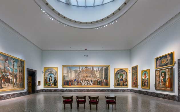 La predica di San Marco di Gentile e Giovanni Bellini che campeggiava alle spalle dei relatori ha acquistato istantaneamente luce e profondità restituendo al pubblico i colori, le architetture e le atmosfere immaginate nel 1504. Il nuovo sistema di illuminazione, messo a punto e sperimentato da Erco insieme alla Soprintendente della pinacoteca Sandrina Bandera, miscela luci LED di due diverse tonalità (3000°K, bianco/calda, e 4000°K, bianco neutro) per far emergere le cromie naturali e assicurare una corretta lettura anche dei minimi dettagli.