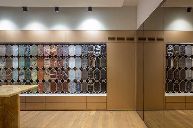 Il piano seminterrato è dedicato alle superfici classiche e alla “marmoteca”, un mondo magico nel quale vengono presentati marmi e onici.