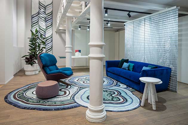 I 350 mq si sviluppano su tre piani dedicati a usi distinti: il piano terra presenta le collezioni di design intese come superfici e complementi d’arredo e comprende un’elegante area lounge che si affaccia sul cortile interno in stile Liberty del palazzo.