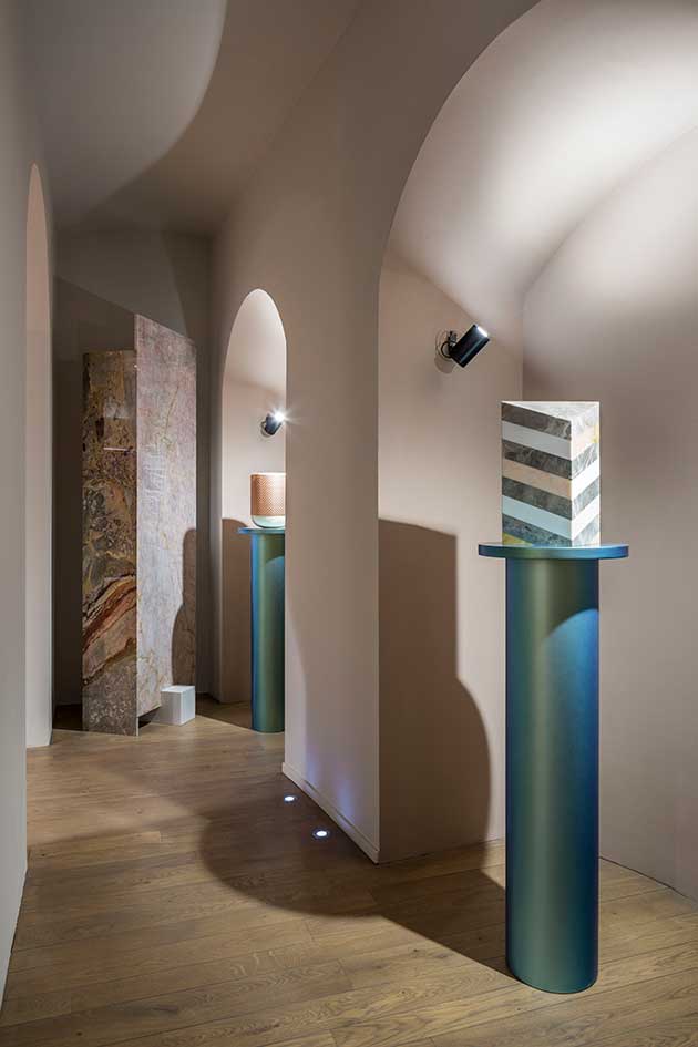 «Il concept dello showroom nasce dall’idea di “dare la parola al marmo”, ovvero di raccontare un percorso che inizia dalla materia prima per trasformarsi in diversi linguaggi. Il marmo è solo apparentemente rigido e austero, in realtà ha tanto da esprimere. Sta a noi che lavoriamo a comprenderlo e a dargli la parola», sostiene Alessandra Malagoli Budri, Art Director dell’azienda di Mirandola.