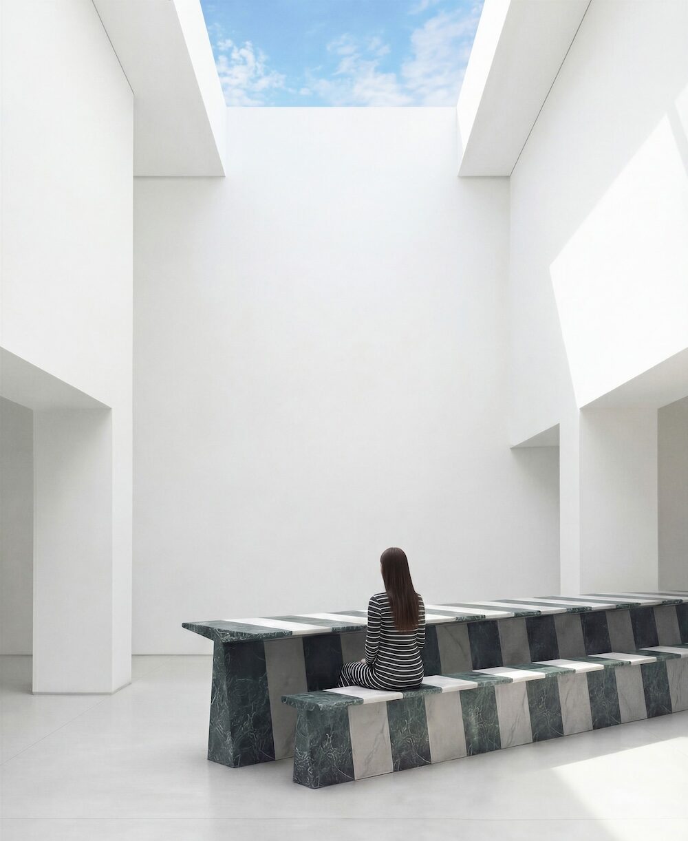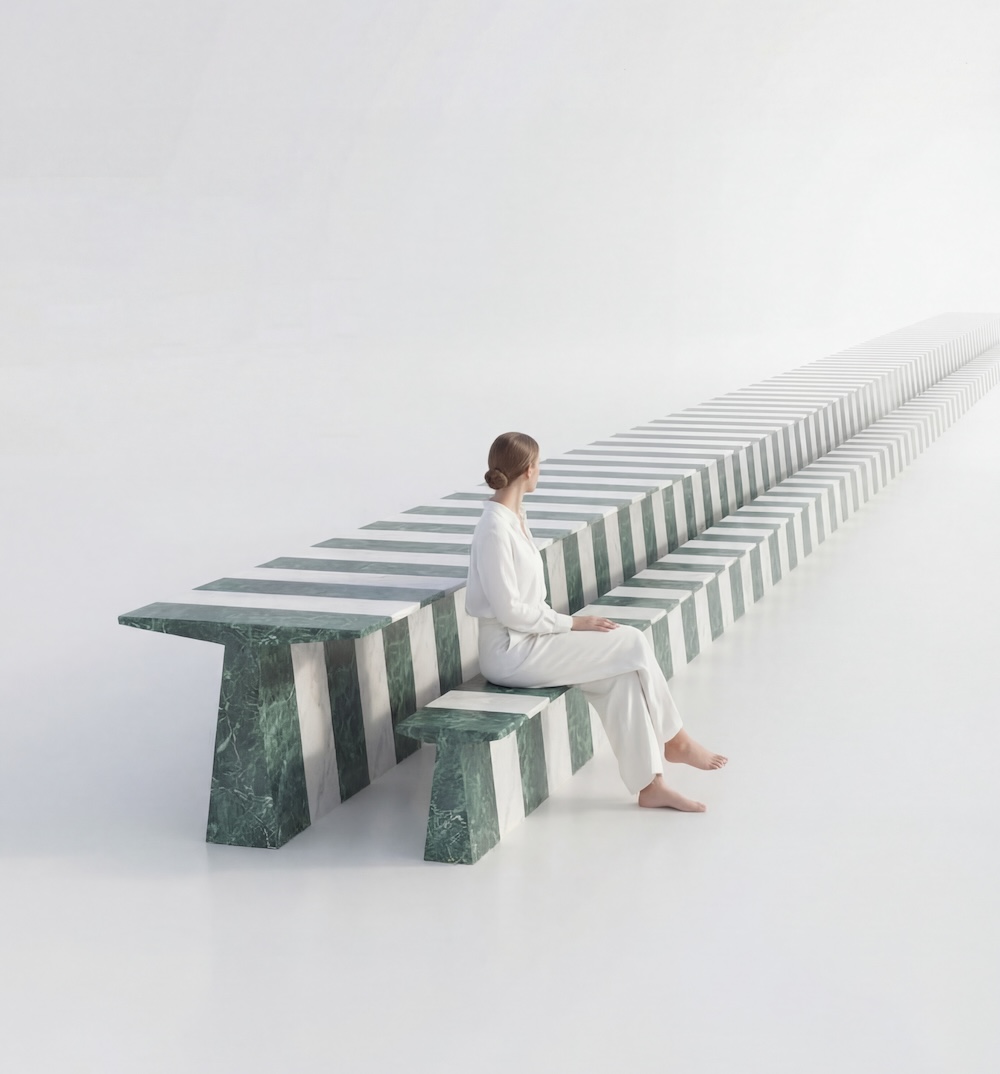 La bicromia bianco-verde richiama la tradizione lapidea toscana e rilegge in chiave contemporanea l’alternanza cromatica tipica dell’architettura storica, attraverso l’utilizzo del marmo Verde Alpi accostato al bianco. Il progetto mette così in relazione memoria materiale e sistema modulare contemporaneo, proponendo una riflessione sul rapporto tra artigianato, tecnologia e sostenibilità.