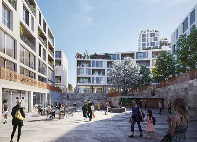 È prevista anche una gestione idrica sostenibile per l’intero ciclo dell’acqua, valorizzando e riutilizzando le acque meteoriche, evitando la saturazione delle reti fognarie e minimizzando il consumo e lo spreco. Un sistema innovativo di teleriscaldamento di quarta generazione (4GDH) sarà alimentato da fonti di energia rinnovabili e includerà un sistema di recupero di calore dalle acque reflue. Vasche per la coltura acquaponica integreranno due cicli generalmente separati, l’acquacoltura e l’orticoltura idroponica, minimizzando sia gli input chimici che gli output di scarti.
