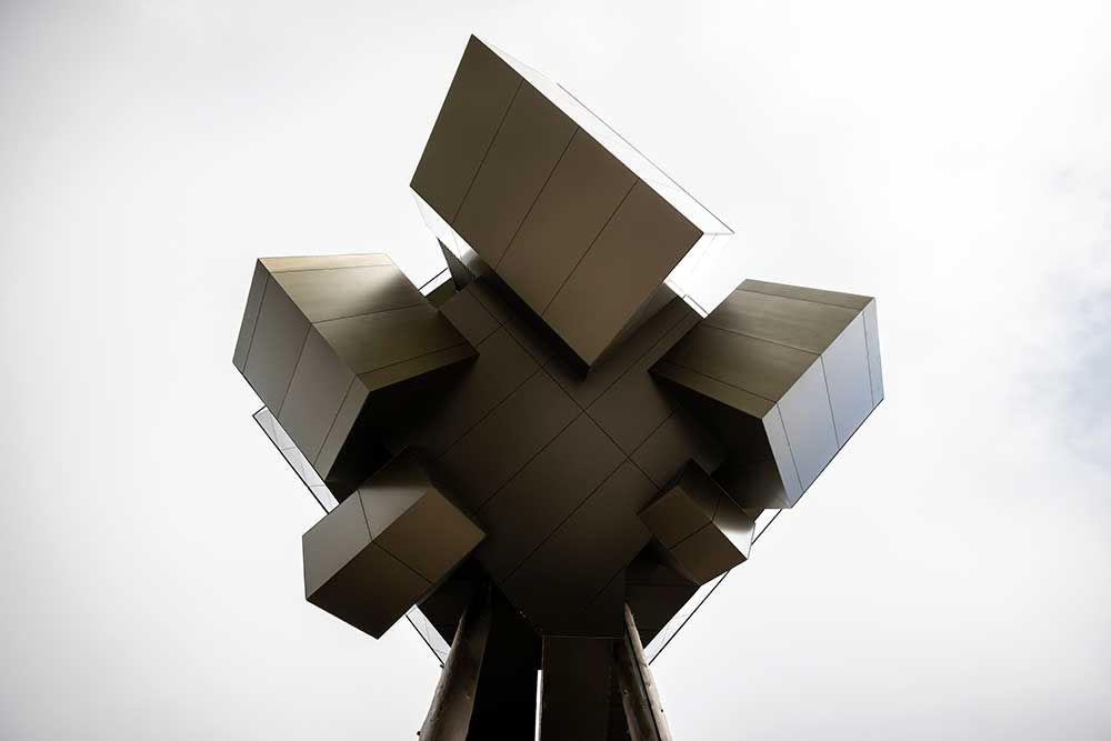 Elemento di sorpresa è il livello inferiore della piattaforma, dove l’orizzonte subisce una rotazione di 180° e le capanne sembrano ancorate a testa in giù.