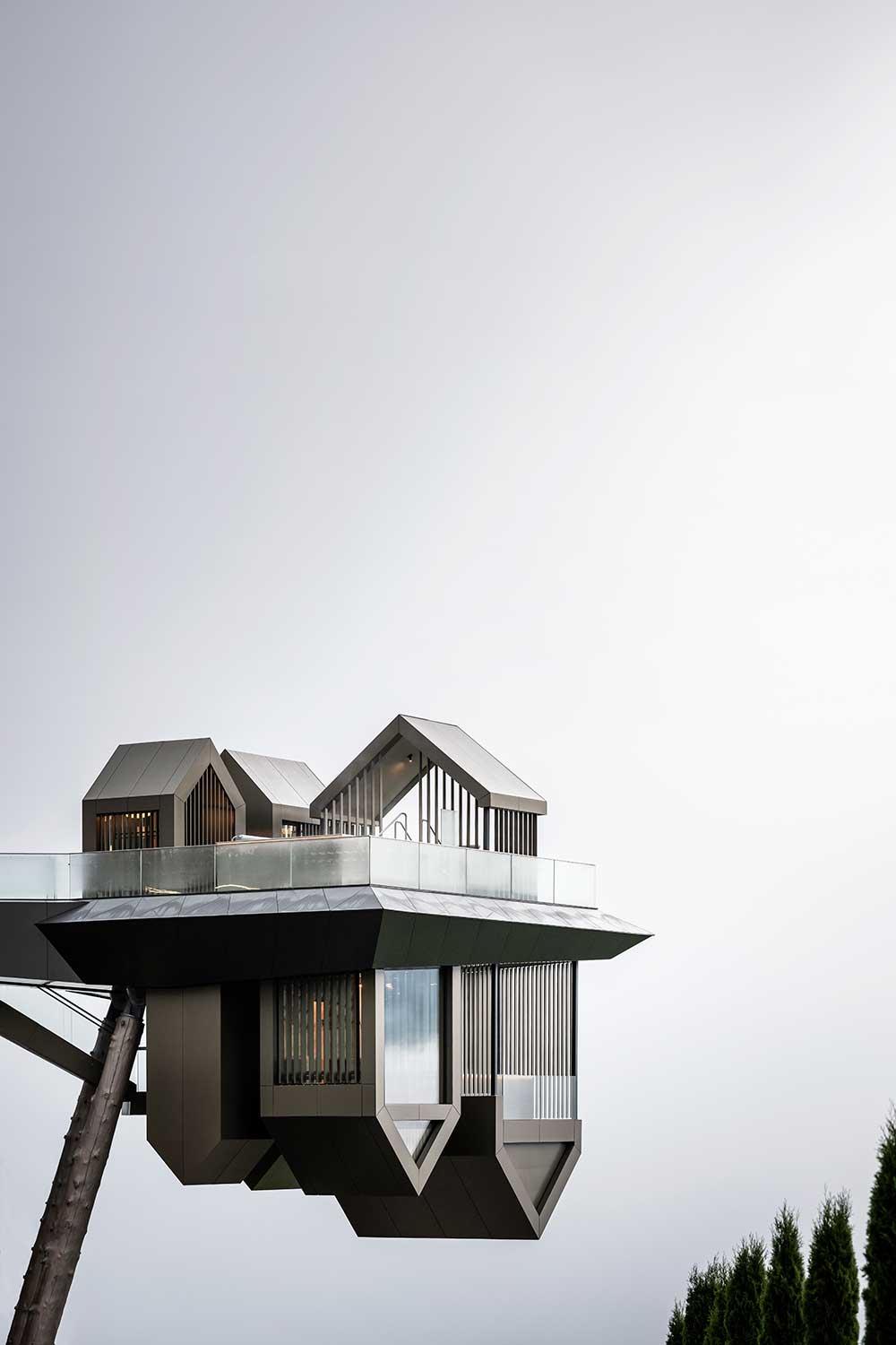 La nuova costruzione si colloca sul lato sud-est di facciata, in posizione speculare rispetto alla piscina e, proprio come la piscina, si stacca dal corpo principale della struttura con una piattaforma a sbalzo sospesa di 15 metri al di sopra del livello del terreno e sorretta da due pilastri rivestiti in tronchi di larice, analoghi a quelli che ritmano il prospetto retrostante.