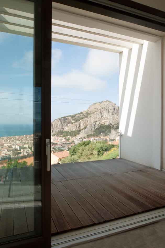Due bianchi parallelepipedi si affacciano sospesi su Cefalù e il suo golfo con cornici che non nascondono il richiamo all´espressività metafisica della Finestra sul mare di Tano Festa, l´installazione della Fiumara d´Arte poco distante da qui. Situato sulla collina Sant’Elia che guarda Cefalù, il centro storico e il suo golfo, il lotto interessato dall’intervento degli architetti Mariano Farinella e Matteo Franco presenta una forma irregolare e cela al suo interno i resti di una piccola cava di roccia riconquistata nel tempo dalla macchia mediterranea. Il nuovo edificio, una residenza unifamiliare, si colloca ai margini di un contesto già urbanizzato, con un carattere dispositivo assolutamente autonomo rispetto agli edifici vicini, proiettandosi interamente verso lo spazio antistante. Il corpo di fabbrica è frutto di una scomposizione in due blocchi fortemente aggettanti dalla montagna, quasi ad evocare due costoni di roccia appena cavati, che ruotano incernierati, uno indicando la giacitura di corso Ruggero, l’altro puntando invece all’orizzonte marino, in un meccanismo improntato a reversibilità e leggerezza progettuali, che scaturiscono dall’equilibrio della coesistenza pieni-vuoti.