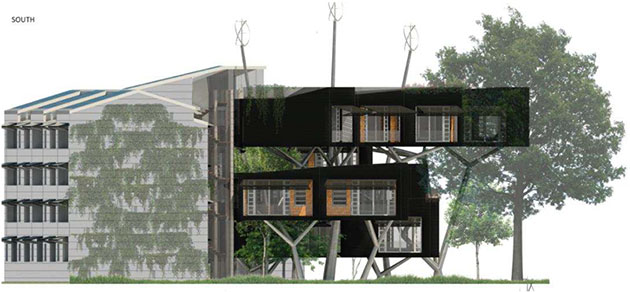 Il progetto Tree Modular-House degli studenti padovani Fantinato e Guaraldo propone un intervento di estensione laterale di un edificio Ina Casa, costruito negli anni Settanta, mediante tre elementi principali: elementi strutturali in acciaio a forma di alberi; nuovi volumi color antracite posati su di essi; collegamento con la scala esterna esistente (tipica della tipologia di edifici Ina Casa). I volumi sono flessibili, grazie ai vari orientamenti, e si adattano alle condizioni del sole e del vento, ottimizzando il comfort interno. La nuova composizione per moduli appare molto leggera. Le travi in acciaio che supportano questi moduli sono elementi strutturali e tecnologici del progetto in quanto integrano un sistema di canalizzazione e raccolta delle acque meteoriche e un sistema di riscaldamento.