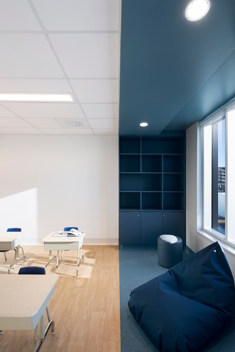 All’interno delle aule, piccole alcove e sedute informali permettono di adattare lo spazio a diversi modi di apprendere e di relazionarsi, riconoscendo la varietà dei percorsi individuali.