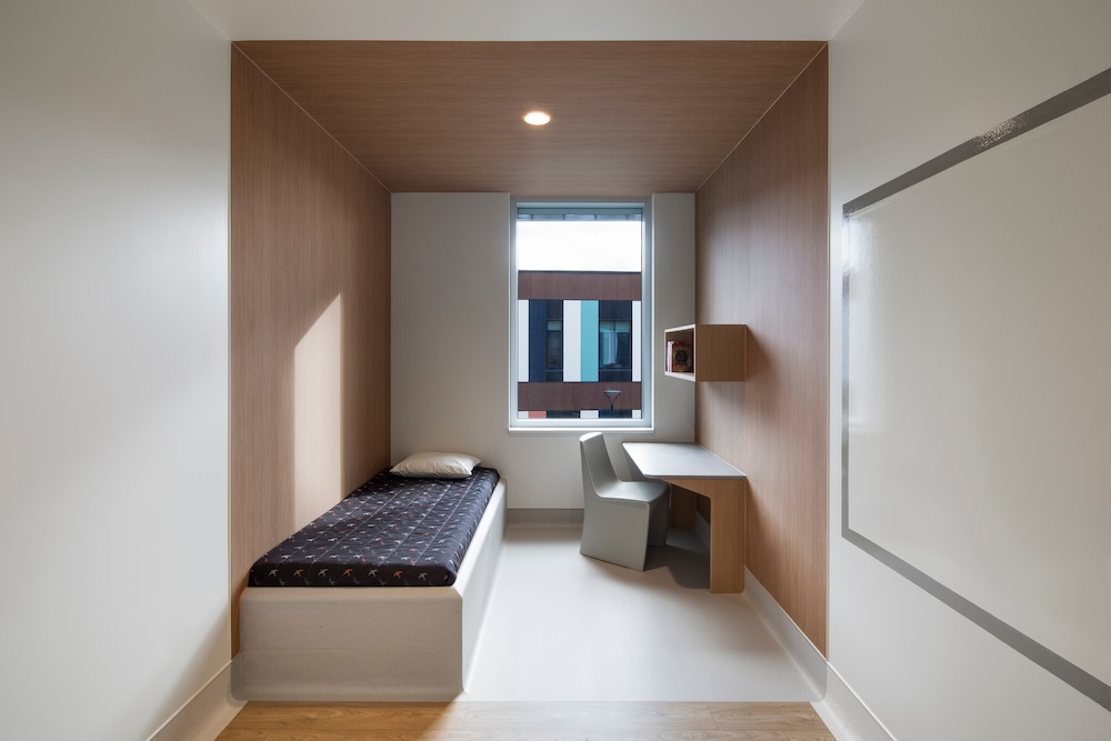 Anche le camere delle unità residenziali sono concepite come spazi protettivi, con pareti in legno, luce morbida e una continuità visiva verso le aree comuni, in cui la dimensione privata si apre al confronto e alla condivisione.