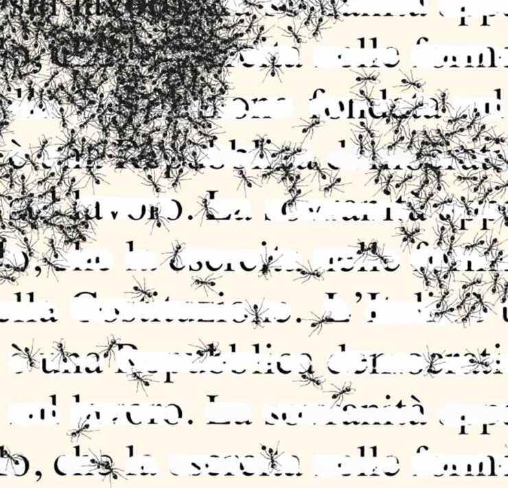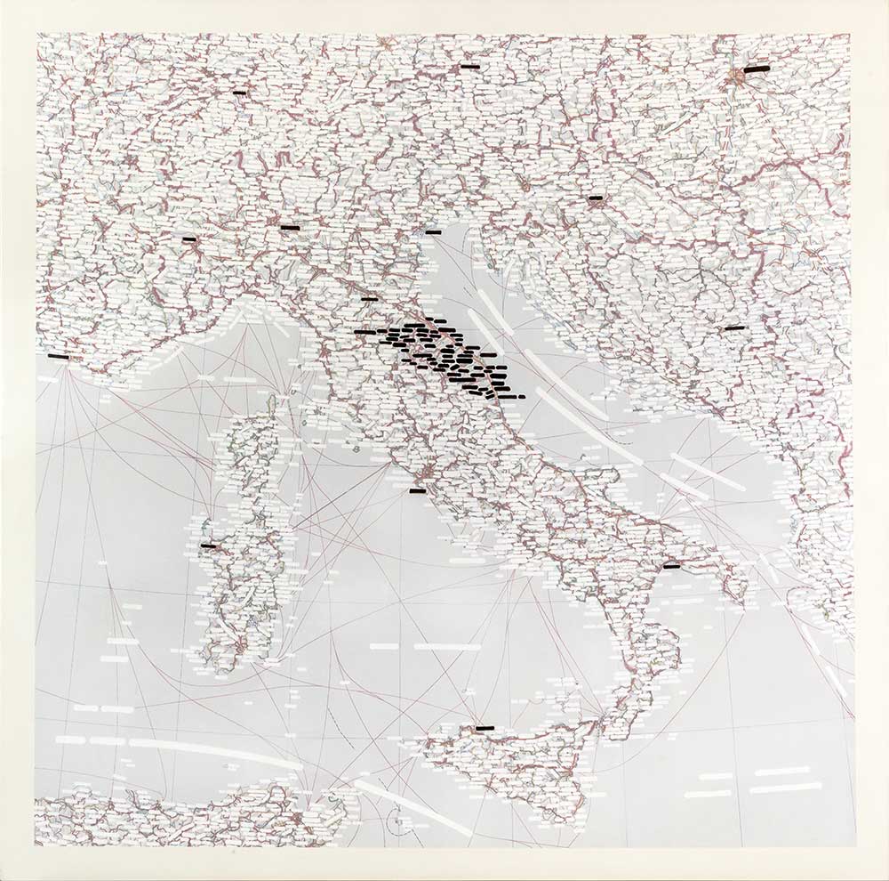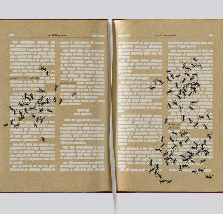 Tra i lavori esposti, spiccano le favole cancellate, le carte geografiche e i mappamondi privati dei nomi di città e continenti, gli sciami di api e formiche in movimento e i semi d’arancia trasformati in sculture simboliche.