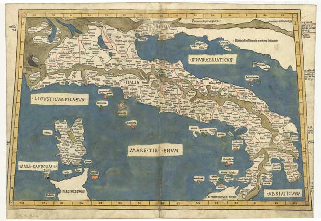| Niccolò Germanico, “Italia”, 1482, xilografia acquerellata, intaglio in legno, 36,5 x 55,5 cmCollezione Roberto Borri |