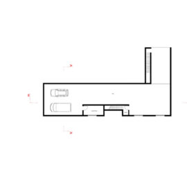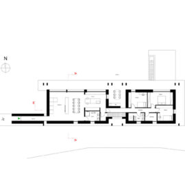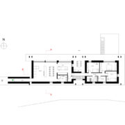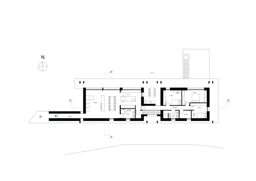 Per disporre di aperture più alte adatte a inquadrare il paesaggio è stata prevista, per gli spazi abitativi, una copertura a un solo spiovente appoggiata su pilastri in cls armato a vista. Le colonne sono alleggerite da elementi di carpenteria che, in particolari condizioni di luce, fanno percepire la copertura quasi sospesa nell’aria.