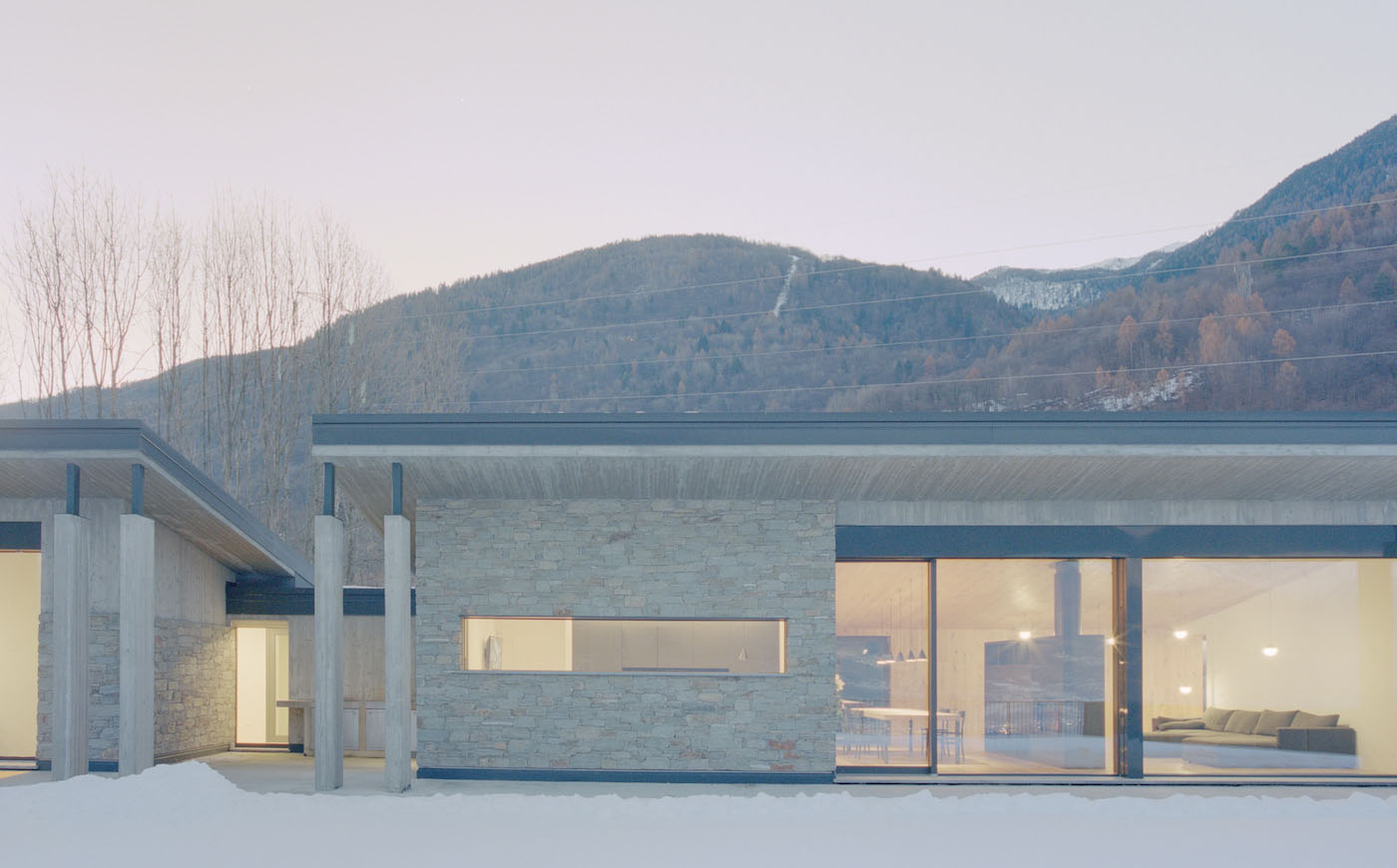 Alfredo Vanotti (Atelier EV+A lab) ha completato un edificio residenziale ai margini di un piccolo comune ai piedi delle Alpi Retiche, in un’area circondata da prati e boschi: un’abitazione unifamiliare in grado di valorizzare appieno le caratteristiche del terreno, in particolare la vista sul fondovalle e sul paesaggio montano.