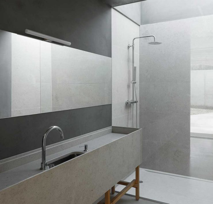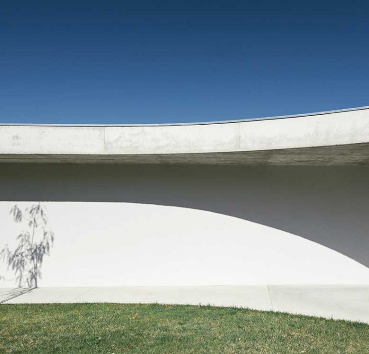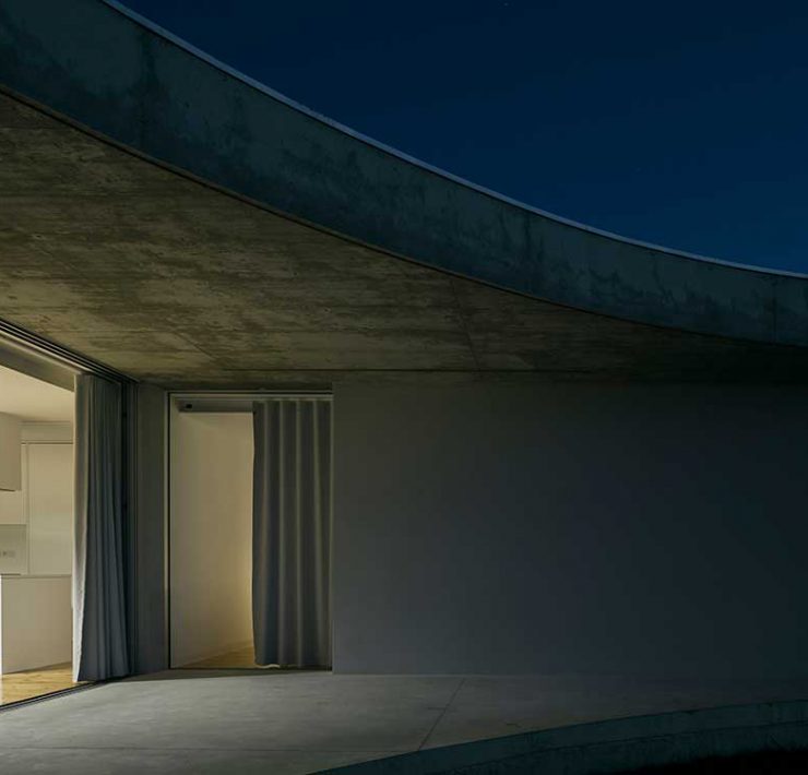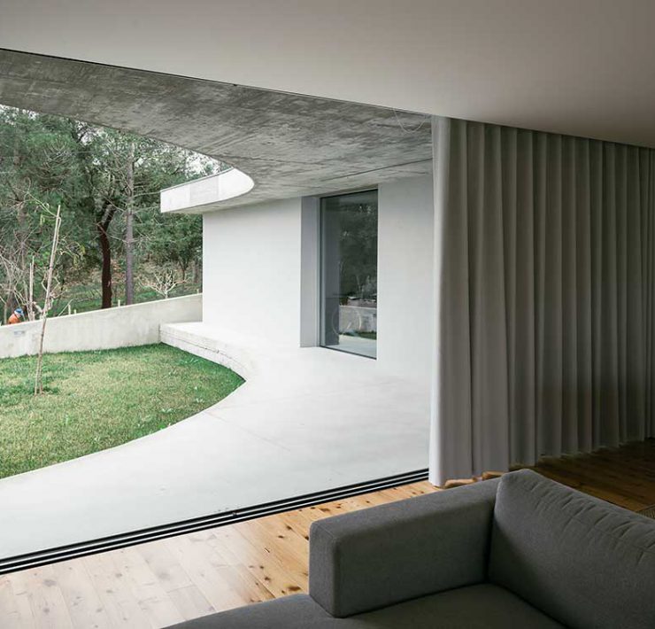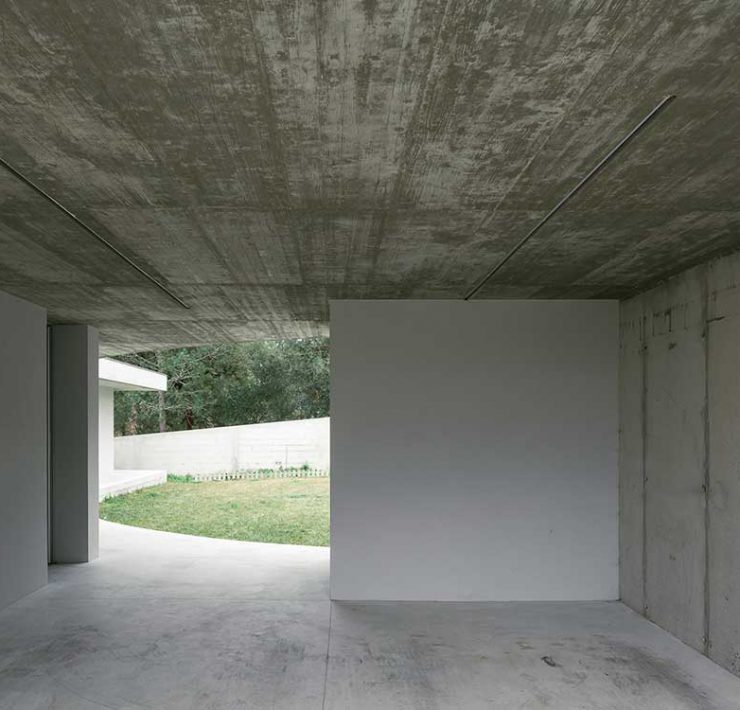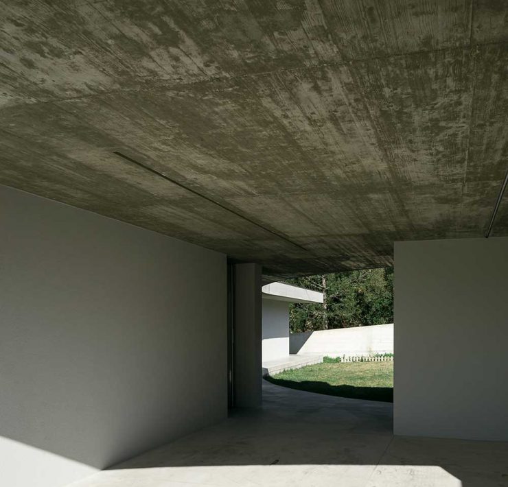 La soluzione applicata dal progettista crea, con la sua forma, piccoli patii interni lungo il perimetro dell’abitazione. Due lastre di cemento definiscono il profilo esterno con un senso di libertà che si ritrova nella creazione degli spazi interni. Gli spazi non sono limitati da muri, ma si estendono, con la natura che funge da unico confine.