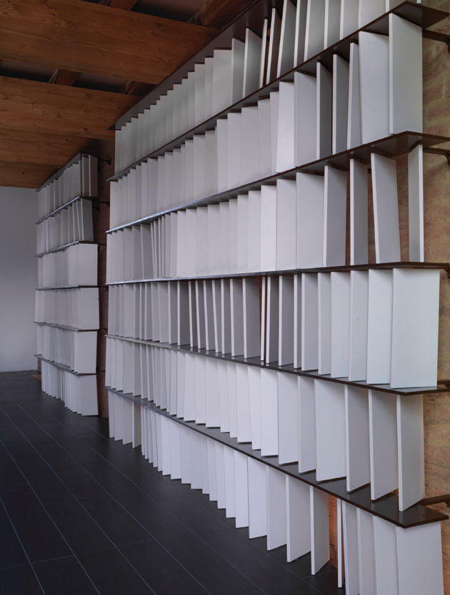 La Library Room è caratterizzata da una parete scaffale con setti in grès porcellanato orientati in modo da assumere forma mutevole in funzione della diversa posizione da cui si osservano. |