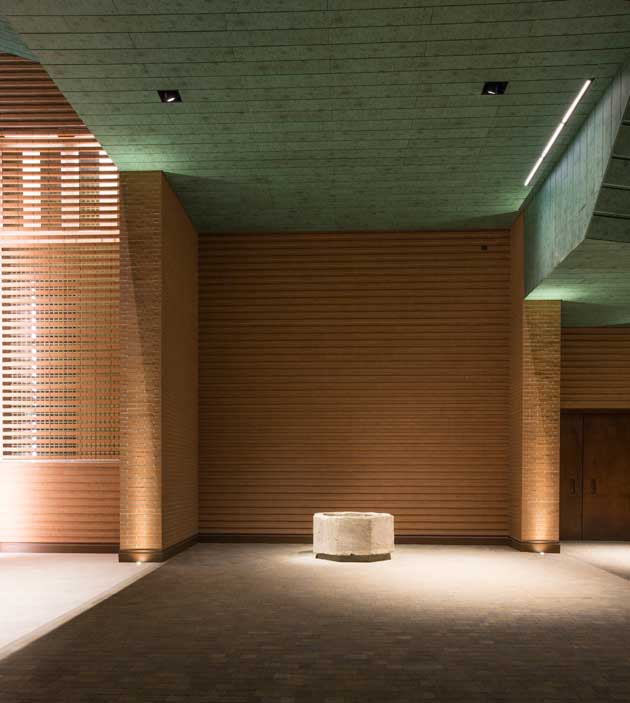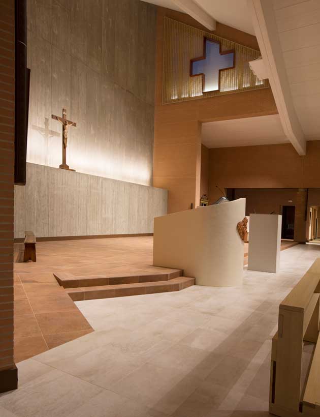 Le grandi vetrate della chiesa, alternate ad ampie pareti effetto brise-soleil in listelli di cotto, sono state progettate in modo da consentire la costante illuminazione diurna della struttura, in posizione zenitale a nord nel fonte battesimale, a sud nella custodia del Santissimo e nel coro. L’interno si trova così avvolto perimetralmente da tenui bagliori di luce, mutevoli con il passare delle ore, conservando nel cuore dell’aula domenicale un’atmosfera soffusa e raccolta, ideale per la meditazione e la preghiera.