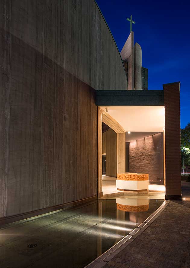 Dai primi momenti del crepuscolo, invece, fino all’oscurità della notte, l’illuminazione degli spazi interni mima il comportamento di quella diurna attraverso la sapiente collocazione della luce in punti strategici come i corridoi, lo sfondo dell’aula e il presbiterio, che ospita altare, ambone e sedute dei ministranti. L’immagine del Cristo in croce è illuminata contemporaneamente dall’alto e dal basso con l’utilizzo di apparecchi illuminotecnici dalle ottiche ellissoidali, prodotti che, con la loro miniaturizzazione, imitano la pienezza della luce solare senza dare percezione della loro presenza.