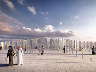 1.680 colonne in alluminio riciclato a sezione triangolare disposte come in un campo magnetico che…