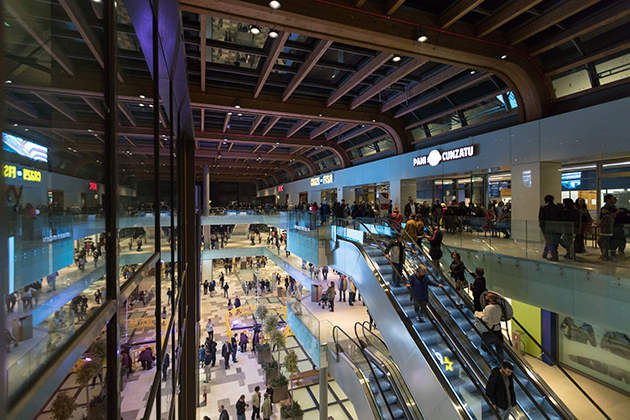 L´annullamento della distinzione tra interno ed esterno viene sottolineato dalla scelta della copertura della terrazza-food court, realizzata in legno lamellare e vetro, elemento architettonico che privilegia l´uso della luce naturale capace di illuminare parte della galleria. Anche per il concept degli interni si è tenuto conto della natura urbana del centro, in cui la galleria è concepita come elemento di connessione e come luogo di passeggio.
