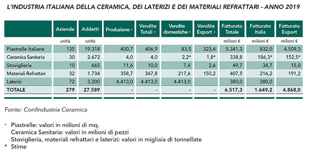Sono complessivamente 279 le industrie del settore ceramico – piastrelle e lastre, ceramica sanitaria, porcellana e stoviglieria, materiali refrattari e ceramica tecnica, laterizi – attive in Italia nel 2019. Occupano oltre 27.500 addetti e hanno sviluppato un fatturato di 6,5 miliardi di euro. A questi numeri si aggiunge l’internazionalizzazione produttiva in Europa e Nord America.