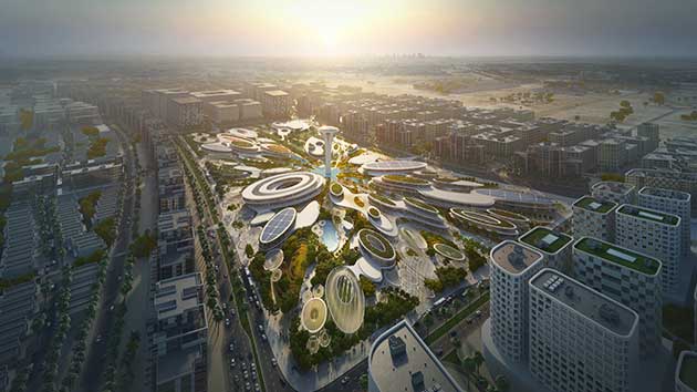 La torre di osservazione centrale è circondata da piazze con laghetti e fontane alimentate con acqua riciclata. Pensiline tensili mantengono a livello del suolo un microclima che favorisce la crescita della vegetazione.