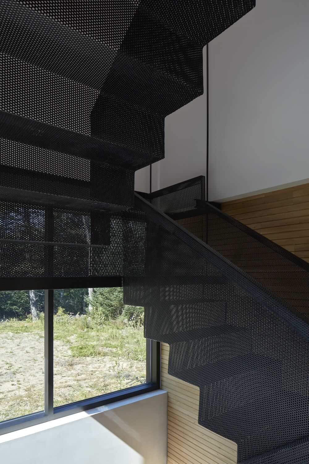 Dal design minimalista, il piano terra presenta due camere da letto e una scala realizzata con una piastra di acciaio perforata e piegata che conduce al piano superiore dove si trova un unico ambiente. Da lì una semplice scaletta a pioli, sempre in ferro, conduce al soppalco ricavato sotto le falde inclinate del tetto.