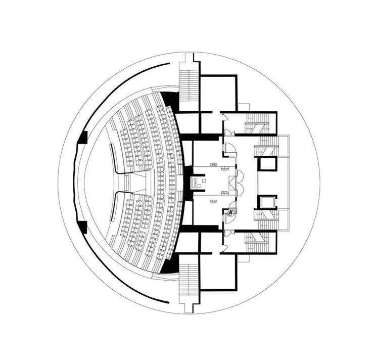 Due ascensori panoramici e una scala fluttuante di 11 metri attraversano l’edificio, collegando l’atrio all’ingresso della sala. La capienza è stata ridotta a 286 posti su misura, con sei diverse inclinazioni per il massimo comfort degli spettatori.