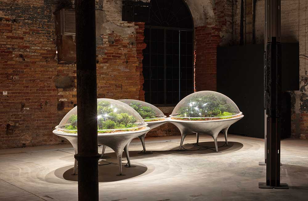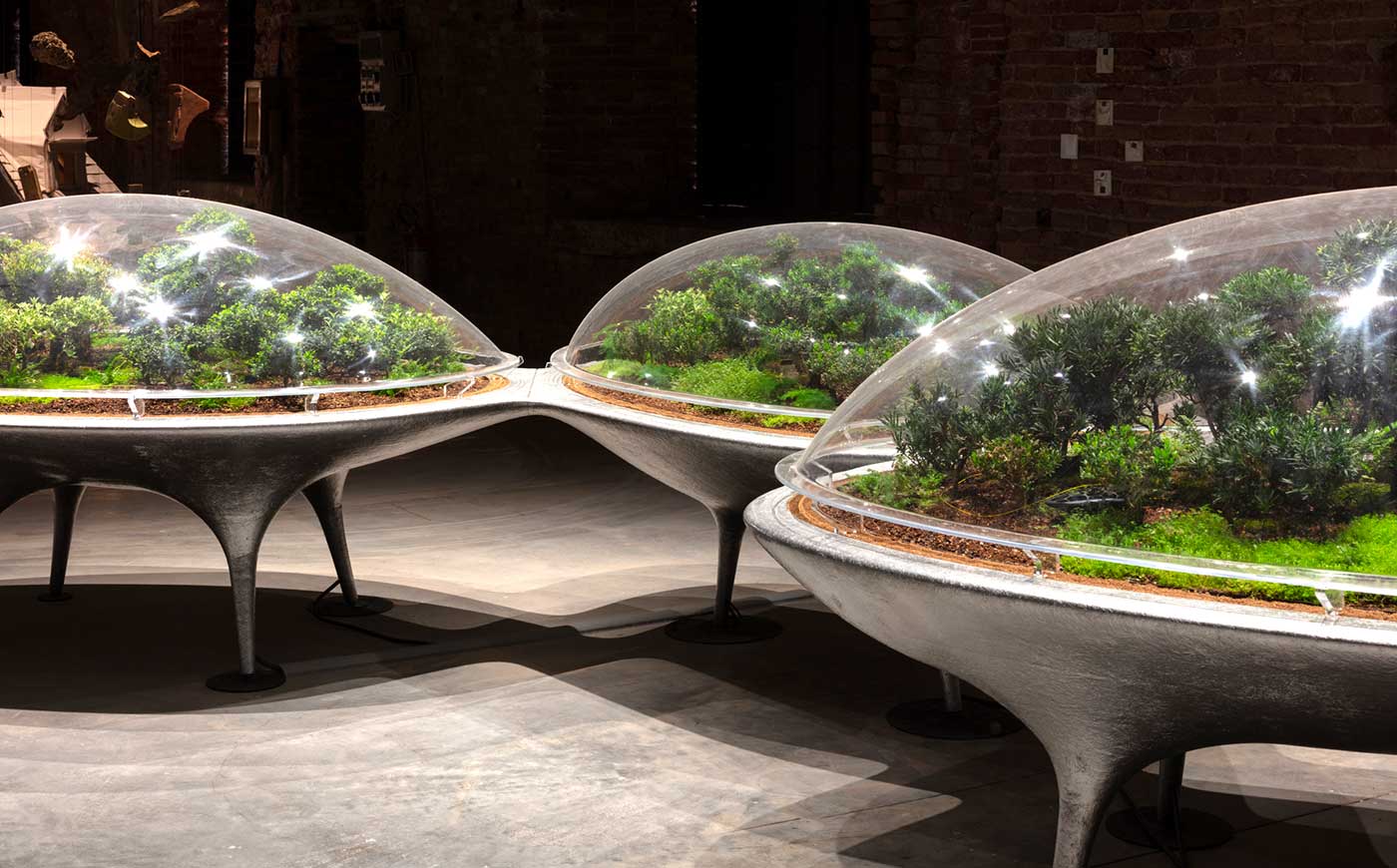 I paesaggi ecologici miniaturizzati di City of Plants, collegati tra loro da cavi in fibra ottica e protetti da calotte semisferiche traslucide, propongono un futuro nel quale l’intelligenza artificiale e la vita vegetale sviluppano una comunicazione diretta e reattiva, trasformando l’ambiente urbano da luogo di controllo a luogo di dialogo ed equilibrio.