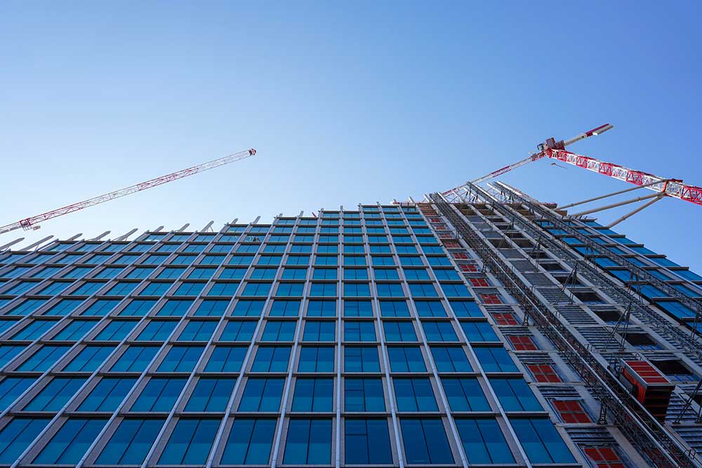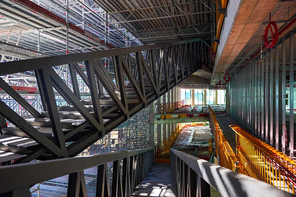 Il cantiere prosegue speditamente anche negli interni, con la posa degli impianti e la costruzione dello scalone monumentale di collegamento a zig-zag tra la lobby e i piani uffici, realizzato in carpenteria metallica con campate fino a 17 metri.