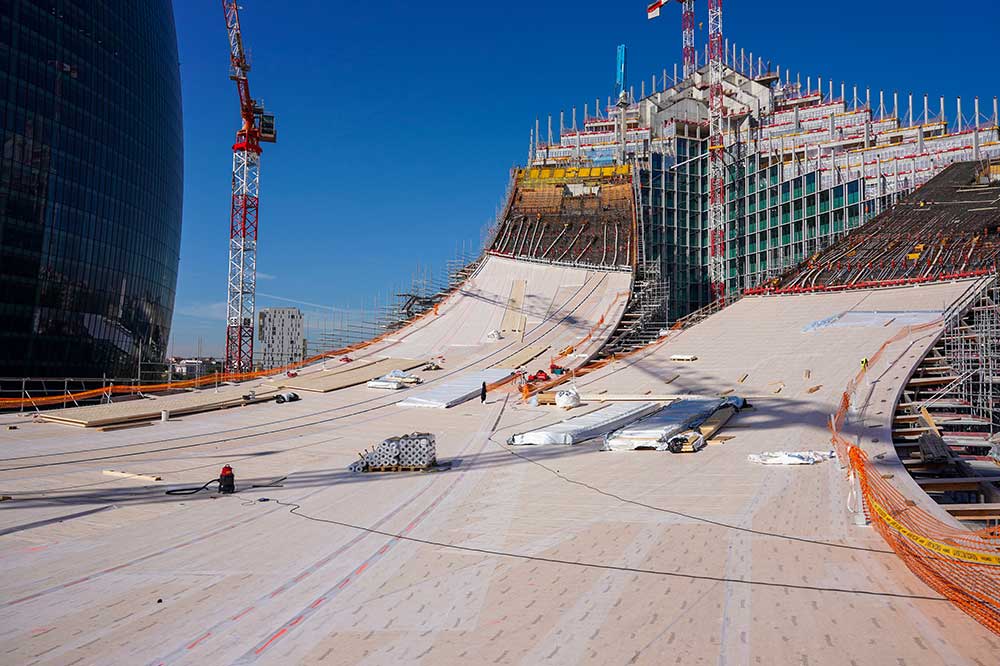 Prosegue a Milano, nell’area di Citylife, la costruzione dello straordinario progetto immaginato da Bjarke Ingels Group: due edifici separati, alti rispettivamente 105 e 55 metri, che sviluppano una superficie utile complessiva di più di 100.000 metri quadrati con prevalente destinazione uffici, collegati tra loro da una grande copertura sospesa – una ‘canopy’ – con una luce di 135 metri la cui forma a onda dà il nome all’intero progetto.