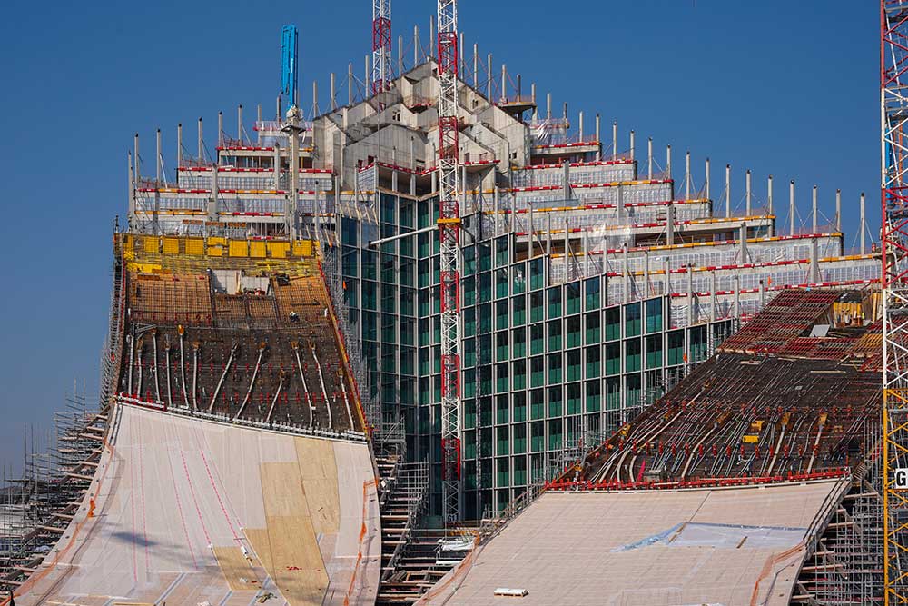 La costruzione delle coperture dei due edifici ha presentato ulteriori complessità dovute alla pendenza variabile tra 25 e 55 gradi. La soluzione adottata ha previsto l’utilizzo di un controcassero superiore, l’impiego di una miscela di calcestruzzo progettata ad hoc da Holcim Italia (classe di resistenza C45/55 con esposizione XC3, consistenza S4 ed S5) e una precisa pianificazione – graduale e controllata – delle sequenze di getto.