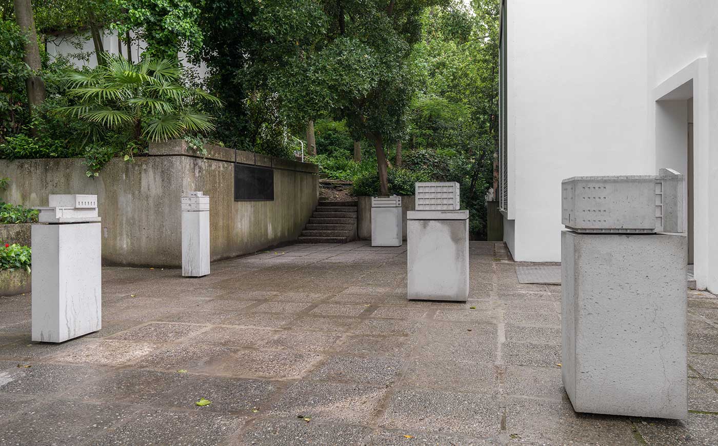Insieme alla mappa, cinque sculture riproducono tipi ricorrenti di vecchie centrali telefoniche, privatizzate e via via demolite o trasformate nei nuovi hub del capitalismo dell’informazione. Nell’installazione ognuna delle sculture, modellate in cemento ma cave, emette un suono unico, basato su sample originali registrati nei rispettivi edifici. Se evocano le vecchie centrali telefoniche pubbliche, destinate a scomparire in tutto il mondo, quei suoni astratti segnano anche il tono delle solitudine contemporanea che l’iperconnessione 24/7 sembra acuire.