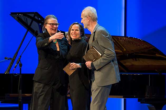 | La cerimonia di premiazione: Anna Chavepayre del Collectif Encore al centro, tra i committenti Birgitta e Staffan Burling. (Photo Jonas Malmström) |