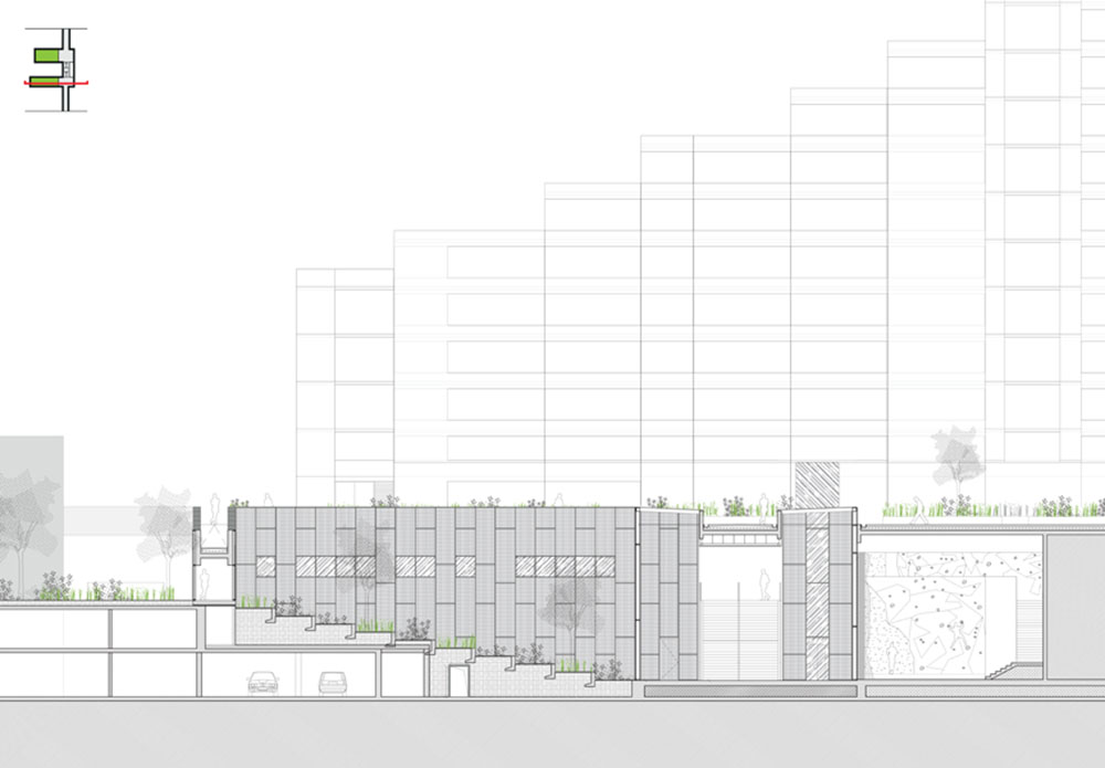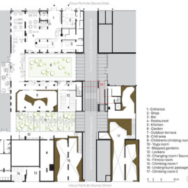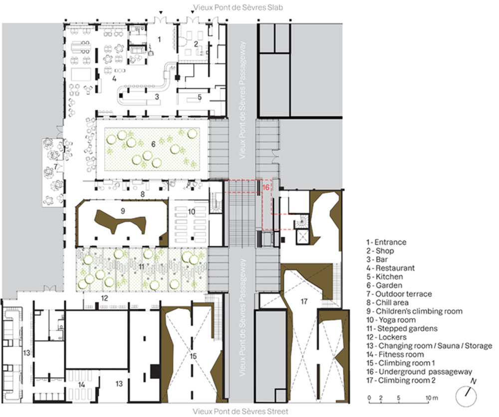 Quelli che erano i tre piani di un garage sono stati aperti creando un ambiente molto alto, con pareti adatte alle arrampicate indoor. Per riunire i due lati opposti del passaggio è stato scavato un tunnel dove sono stati collocati spazi pubblici come un ristorante, un bar, un mercato, un centro fitness, una sala yoga, oltre a giardini pensili.