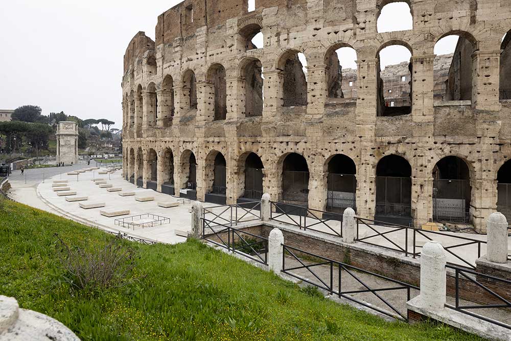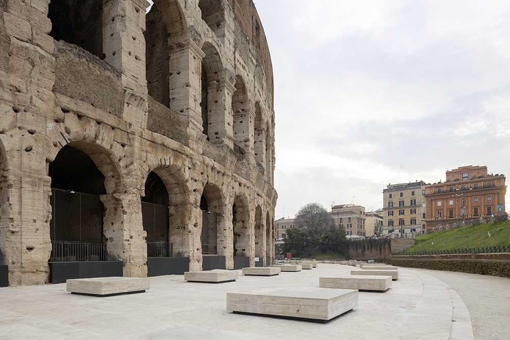 Ma l’operazione progettuale condotta dallo studio Stefano Boeri Interiors è più ampia e si collega alla campagna archeologica condotta a partire dal 2020 dal Parco Archeologico del Colosseo con fondi di compensazione delle opere della Metro C (delibera Cipe n. 67 del 2019), con un’indagine archeologica volta al ripristino delle quote originarie, alla ricostruzione del corretto disegno della crepidine – ovvero il doppio gradino perimetrale che definisce il basamento e funge da limite architettonico tra il monumento e la piazza – e dell’ingombro degli ambulacri crollati, nonché a migliorarne la lettura e la pubblica fruizione.