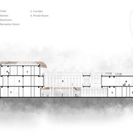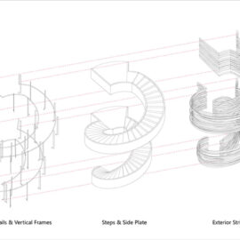 Nel cortile racchiuso dal volume dell’edificio e da una serie di passaggi sopraelevati, una scala a chiocciola consente ai visitatori di accedere alla piattaforma panoramica del secondo piano e fornisce anche un forte focus visivo per lo spazio complessivo. Gradini circolari concentrici con raggi variabili e il parapetto laterale creano una forma dinamica e complessa.