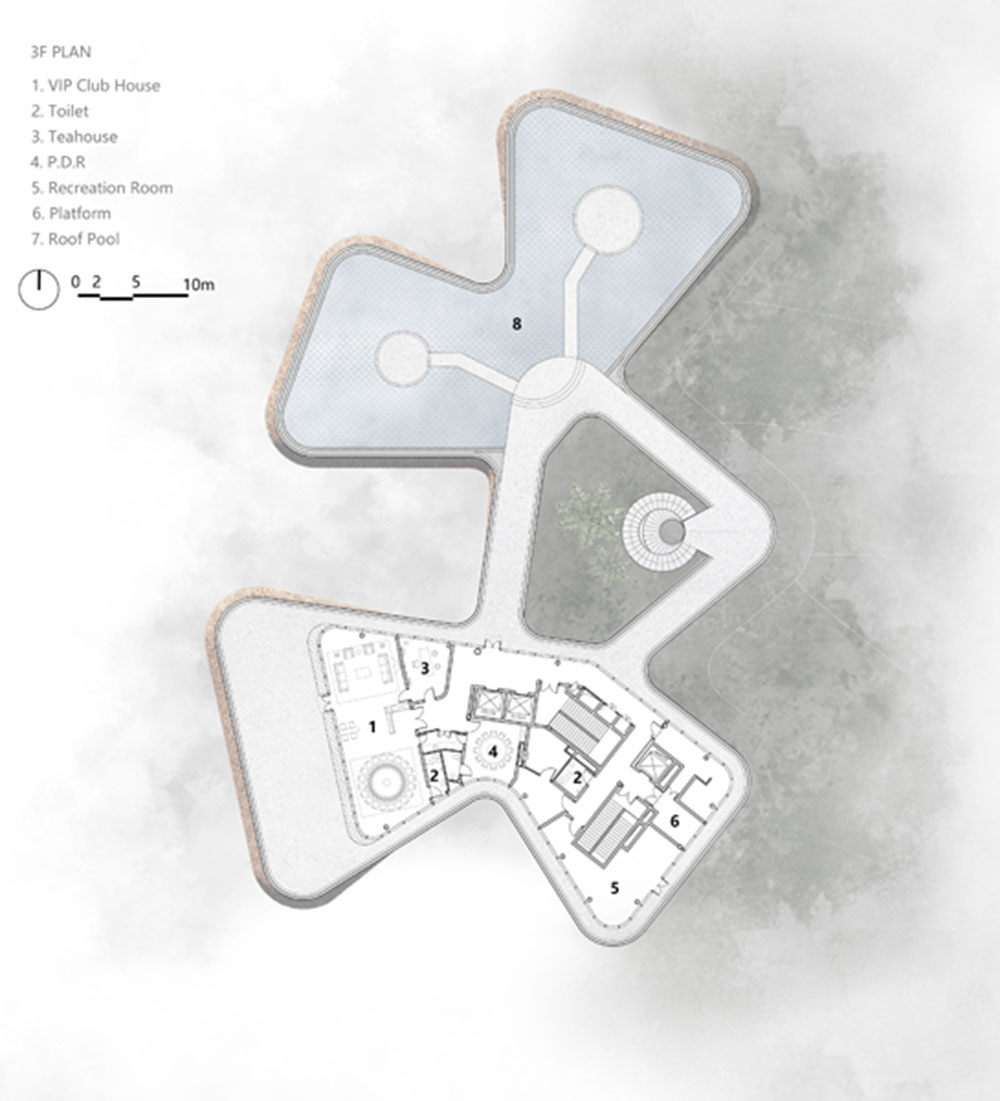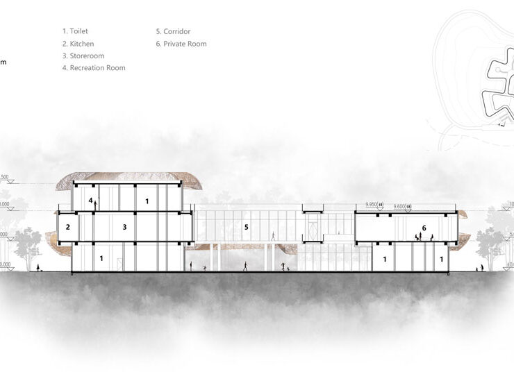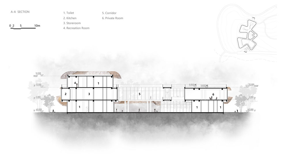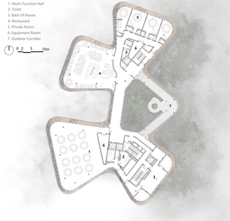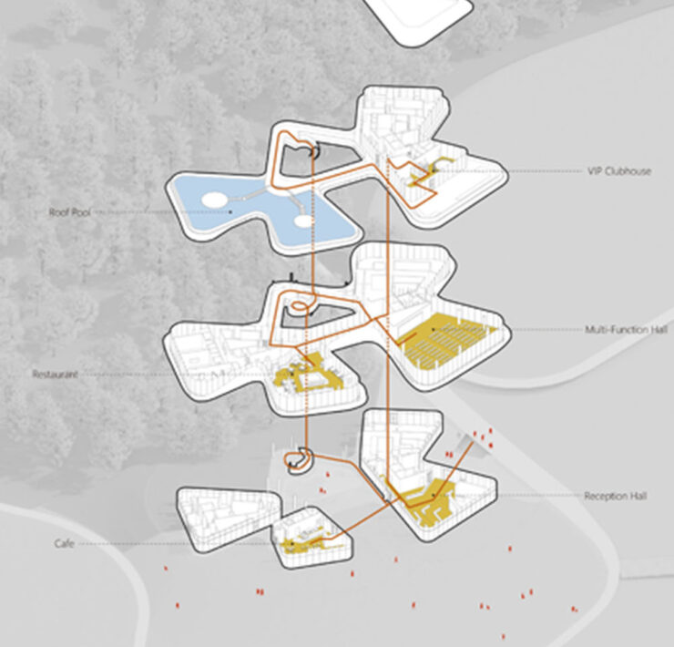 In risposta a questo fenomeno, Jin’ang Yang ha sviluppato per il centro il concept Bamboo Clouds by the Water: un modo per evocare quest’atmosfera fugace e poetica del primo mattino e integrare i quattro elementi del sito – acqua, riva, bambù e nebbia – attraverso l’architettura.