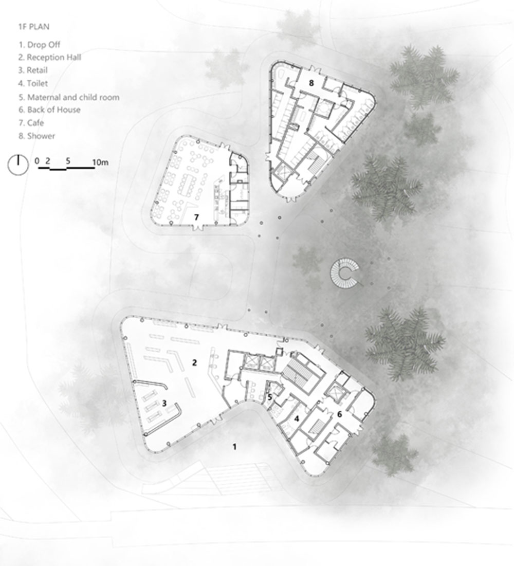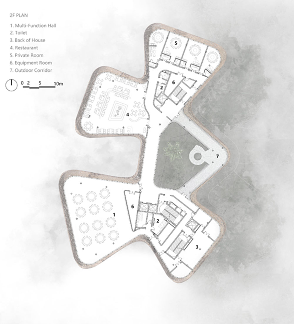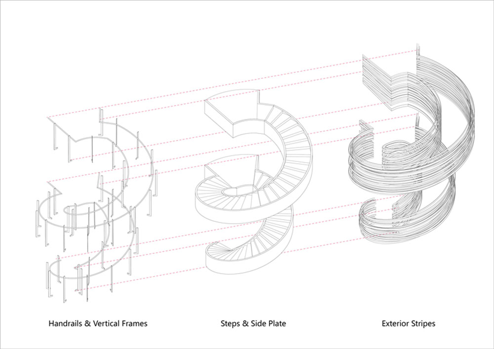 Nel cortile racchiuso dal volume dell’edificio e da una serie di passaggi sopraelevati, una scala a chiocciola consente ai visitatori di accedere alla piattaforma panoramica del secondo piano e fornisce anche un forte focus visivo per lo spazio complessivo. Gradini circolari concentrici con raggi variabili e il parapetto laterale creano una forma dinamica e complessa.