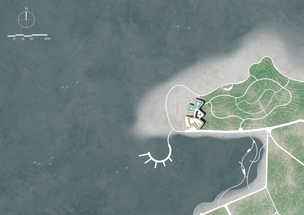 Per ridurre l’impatto sull’ambiente, il planovolumetrico prevede una disposizione decentrata, in modo che la forma complessiva sia divisa in una serie di volumi collegati che ne riducono di fatto la scala percettiva.