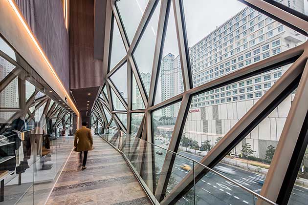 Come un blocco geometrico emerso dalle profondità geologiche, l’edificio appena completato da OMA per l’insegna di grandi magazzini Galleria nella new town di Gwanggyo, non lontano da Seoul, è solcato da percorsi pubblici trasparenti che ai visitatori offrono nuove viste sulla città mentre lasciano trasparire all’esterno parte delle attività commerciali-espositive che vi si svolgono.