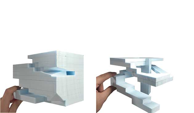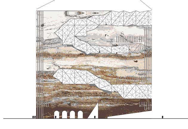 Come diamanti compressi dalla pietra cui alludono le facciate opache, le vetrate tridimensionali che lo attraversano creano terrazze coperte panoramiche e luoghi di incontro e di ristoro.