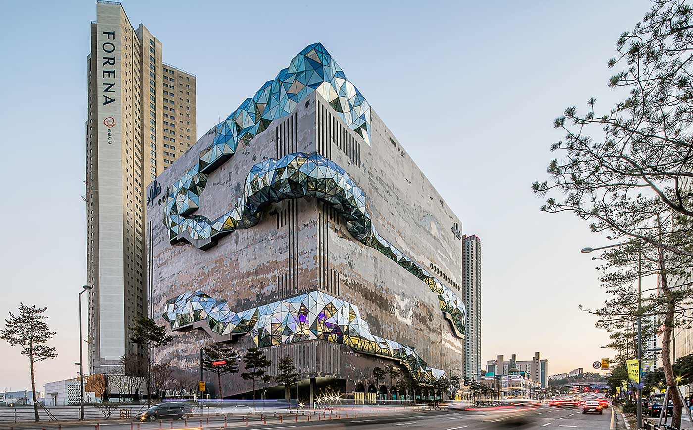 Come un blocco geometrico emerso dalle profondità geologiche, l’edificio appena completato da OMA per l’insegna di grandi magazzini Galleria nella new town di Gwanggyo, non lontano da Seoul, è solcato da percorsi pubblici trasparenti che ai visitatori offrono nuove viste sulla città mentre lasciano trasparire all’esterno parte delle attività commerciali-espositive che vi si svolgono.