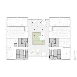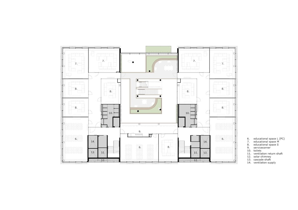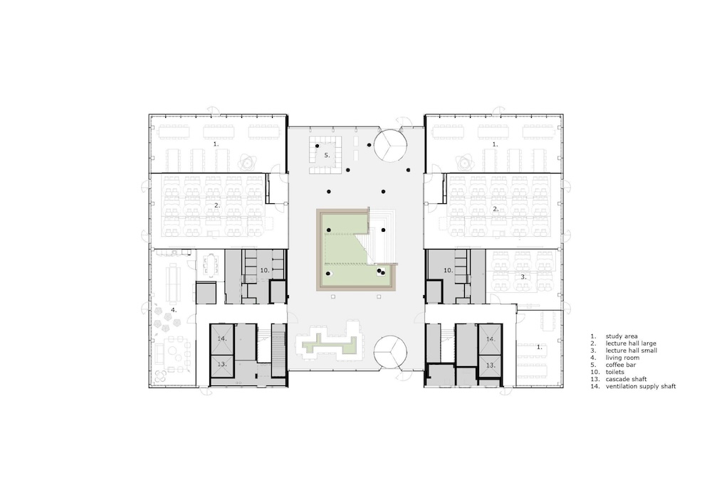 Da vivace e attivo al primo piano, l’ambiente si fa sempre più silenzioso e quieto via via che si sale. Le aule offrono spazio per l’insegnamento, la collaborazione e lo studio silenzioso.