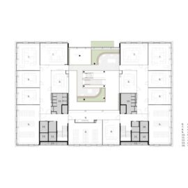 L’atrio si estende visivamente, collegando l’interno con la vivace piazza esterna. Ciò vale anche per le fioriere che si estendono dall’interno all’esterno per fornire habitat per piante autoctone e opportunità di nidificazione per uccelli e insetti. Questa attenta integrazione di spazi verdi che accresce il valore ecologico dell’edificio e crea un ambiente sereno per i suoi utenti.