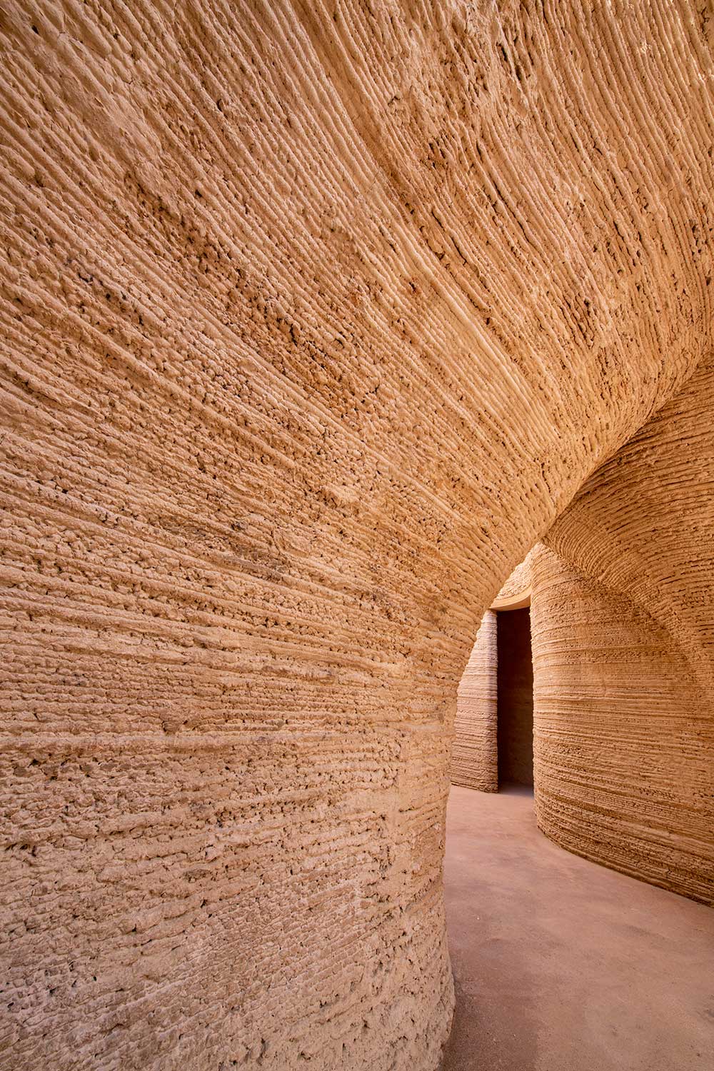 La forma dell’edificio è stata sviluppata pensando alle soluzioni abitative ma anche in relazione al clima e alla latitudine: la composizione della miscela di terra risponde alle condizioni climatiche locali e il riempimento dell’involucro è parametricamente ottimizzato per bilanciare la massa termica, l’isolamento e la ventilazione a seconda delle necessità imposte dal clima.