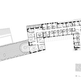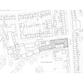 Al contrario della rigida logica a corte dei college inglesi, ereditata dai conventi medievali, il ‘Cohen Quad’ di Alison Brooks Architects si sviluppa con una pianta a S che dà luogo a due cortili, da una parte per la necessità di seguire la forma stretta e allungata del lotto e dall’altra per aprire gli spazi dell’edificio alla luce e alla città.