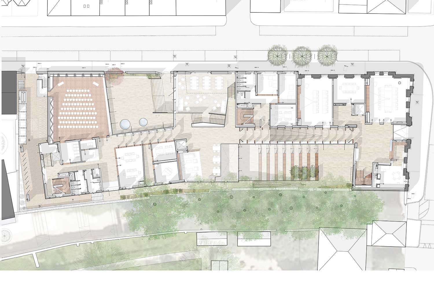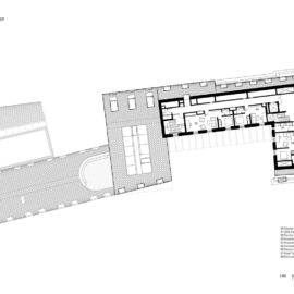 All’angolo nord-ovest del piano terra, il Fitzhugh Auditorium, un luminoso spazio polifunzionale da 110 persone con un tetto curvo in legno lamellare che riceve luce da sud, si affaccia sulla strada pubblica.