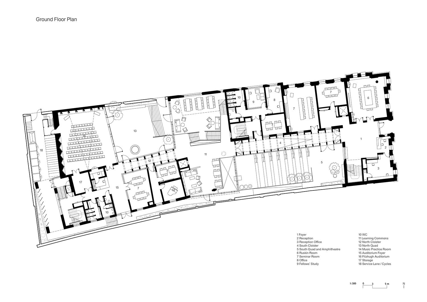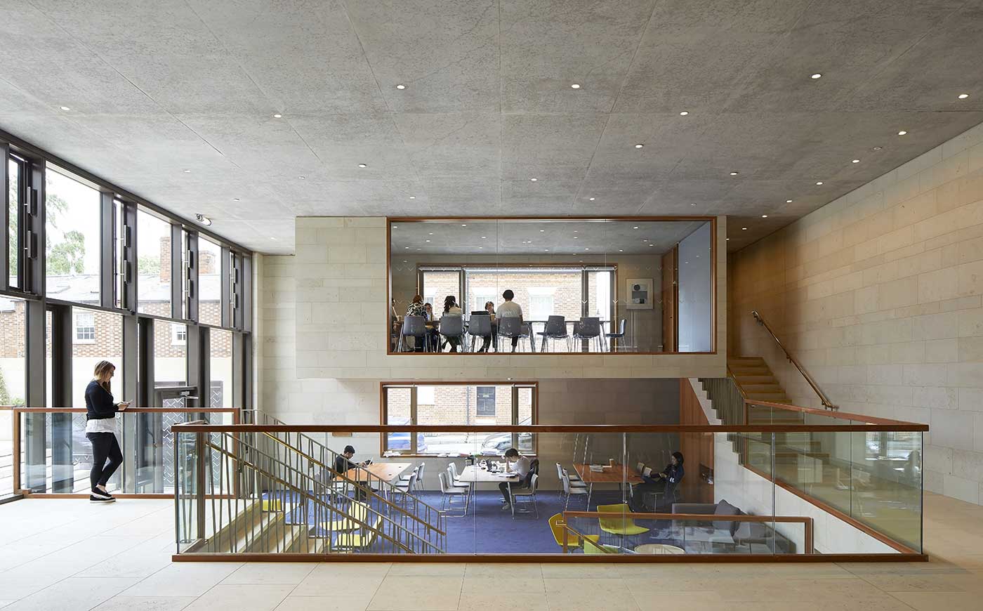 All’ingresso del vecchio Ruskin College, su Walton Street, studenti e visitatori vengono accolti da una sorta di moderno chiostro definito da una successione di archi in legno che li conduce al Learning Commons, luogo di accoglienza e di studio collettivo provvisto di una caffetteria a doppia altezza, un luminoso angolo rivolto verso l’anfiteatro all’aperto e una scala a spirale che collega i quattro piani.