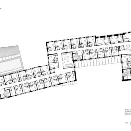 Virtualmente autosufficiente, l’edificio offre una varietà di spazi pubblici e privati, tra cui aule per seminari, uffici, una lavanderia e cucine a isola con tavoli da pranzo per 16 persone ad ognuno dei quattro piani occupati dalle residenze per un totale di 90 studenti e docenti.