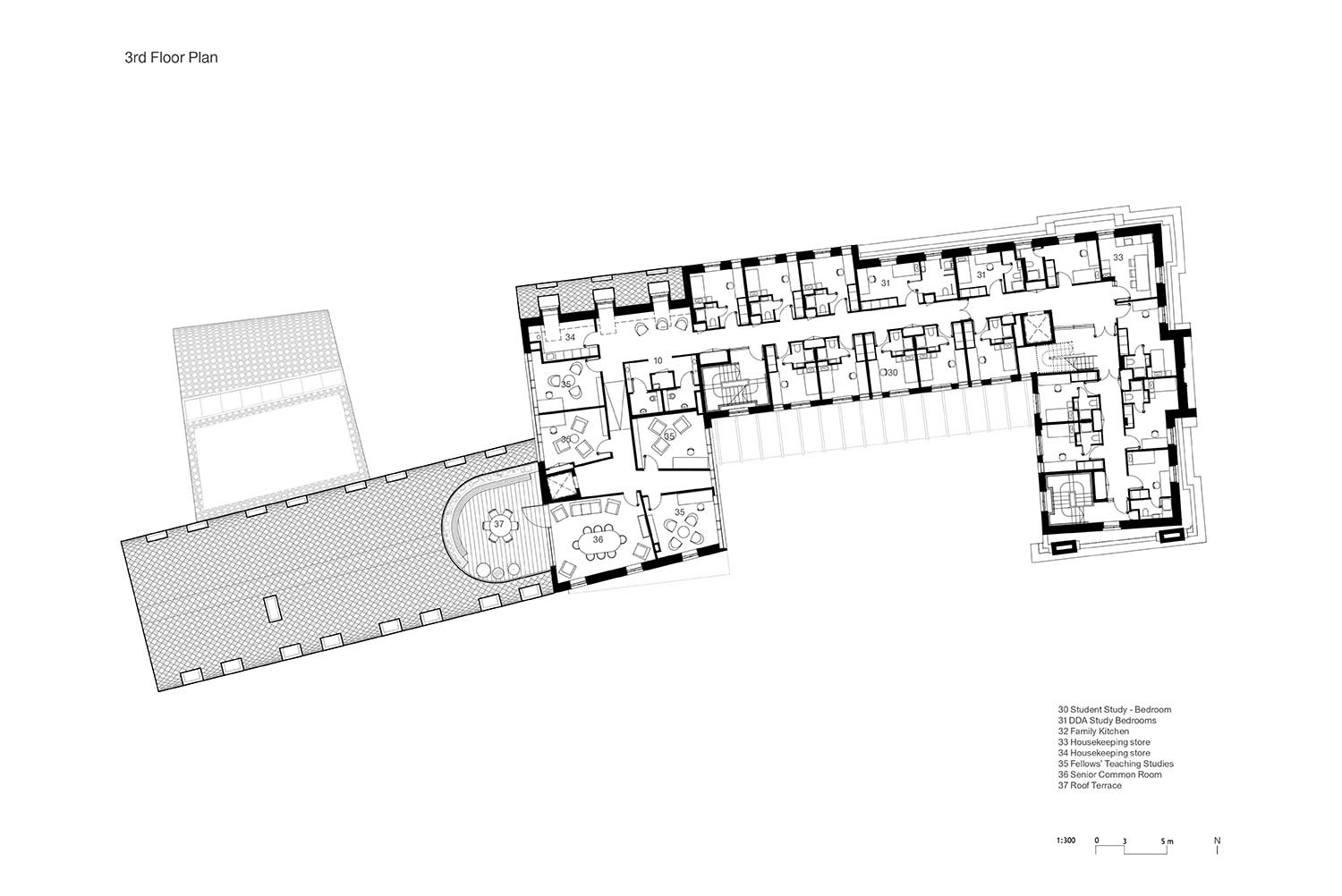 Al terzo piano, cinque aule per la ricerca e l’insegnamento sono raggruppate intorno a una luminosa Senior Common Room che si apre su una terrazza esposta a sud formata da un taglio sinuoso praticato nel tetto.